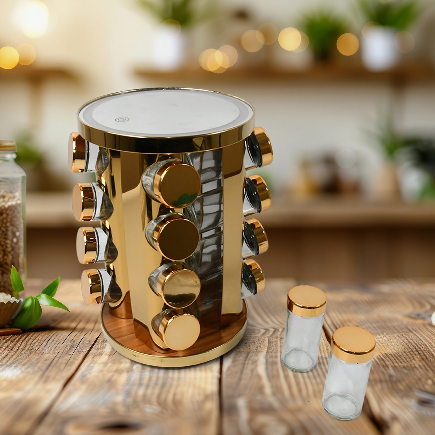 10009 LED Spice Rack Organizer, Rotating Spice Rack with Free 16 Seasoning Jars, Revolving Tower Organizer Stainless Steel for Kitchen Storage (Golden / 16 Pc / MOQ - 6 pc)