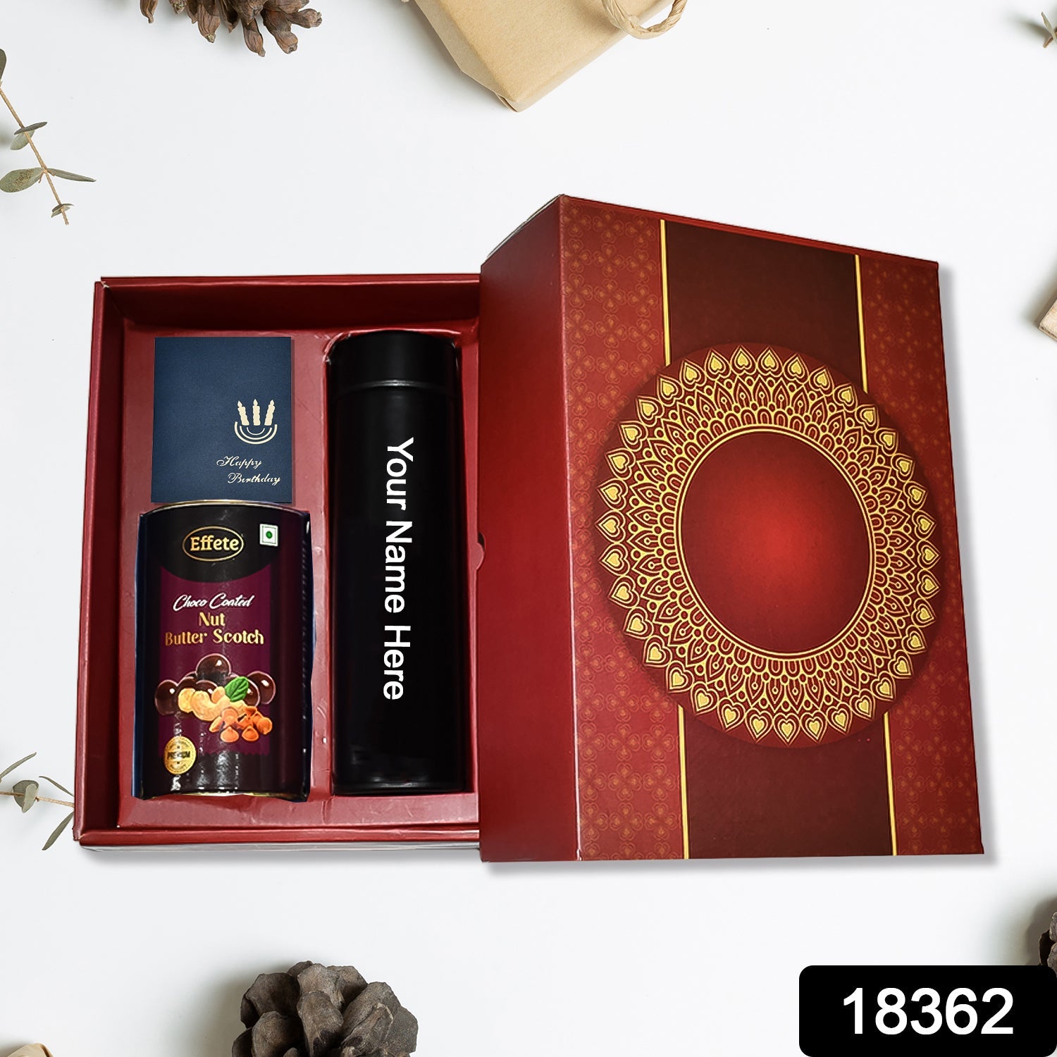 Personalized Temperature Water Bottle, Wising Card & Chocolate (With Attractive Multi Circle Box / 3 Pc Set)