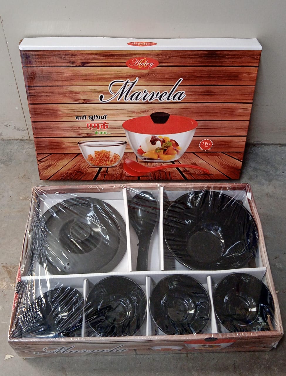 - dinner set come with 4 Medium bowls, 1 Big Bowl With 1 Lid,1 Serving Spoon with Color Box.